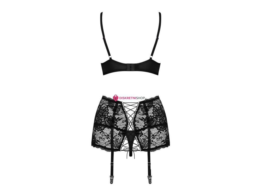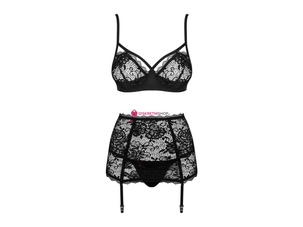 Erotický set OBS S/M s podprsenkou, podvazkovým pásem a tangy okouzlí květinovou krajkou a smyslnými pásky. Kostice, nastavitelné popruhy a vysoký podvazkový pás zajistí perfektní tvar i pohodlí. Ideální volba pro nezapomenutelný večer plný elegance a svádění.