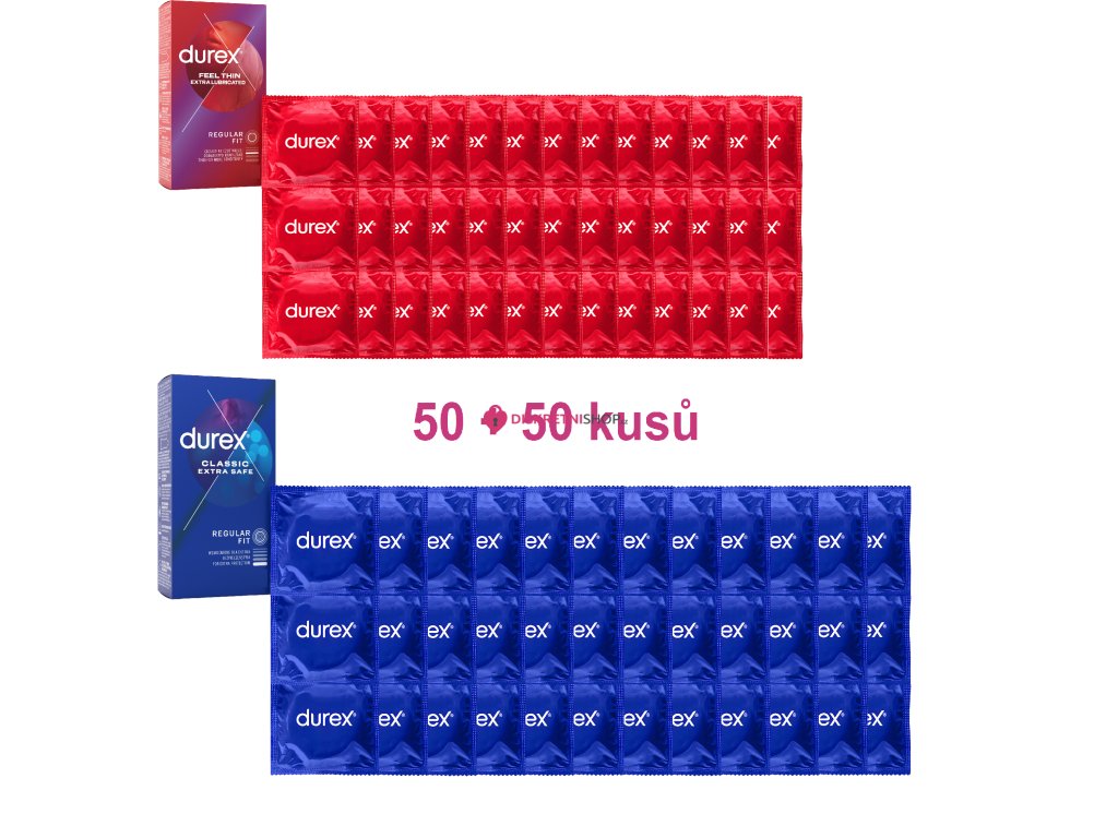 Mix extra bezpečných (Extra Safe) a ultra tenkých (Elite) kondómov Durex po 50ks. Spolu obsahuje balíček 100ks kondómov Durex. Výhodná cena Maxi Mix balenia.